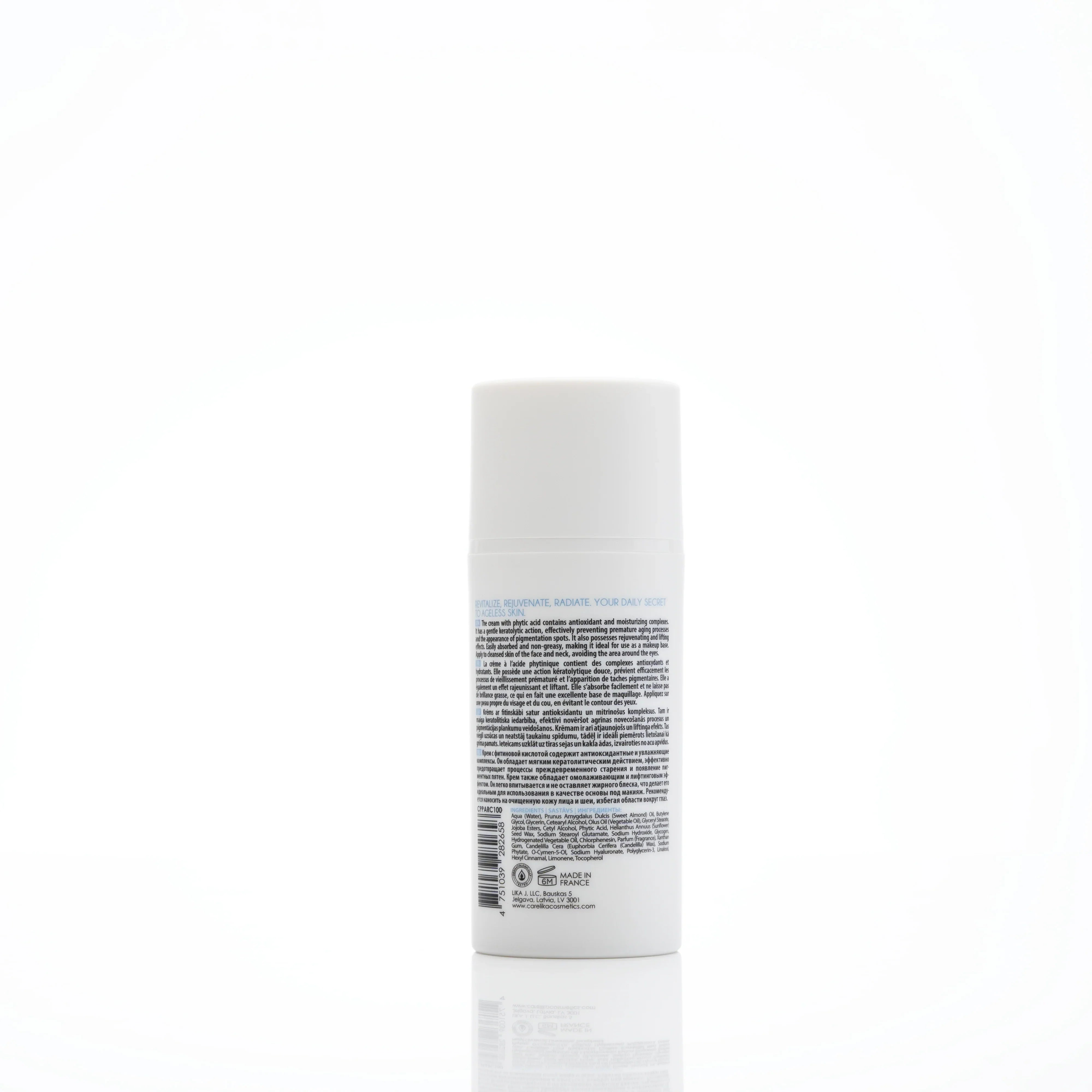 The cream with phytic acid contains antioxidant and moisturizing complexes. It has a gentle keratolytic action, effectively preventing premature aging processes and the appearance of pigmentation spots. It also possesses rejuvenating and lifting effects. Easily absorbed and non-greasy, making it ideal for use as a makeup base.